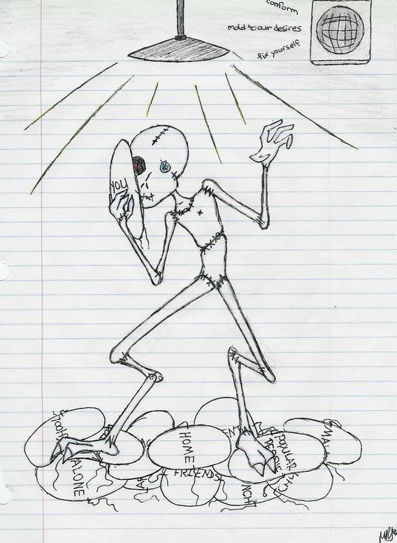 Wow, I really like it and I'm a bit of an art geek. I really like the position the zombie like figure. It seems to be a comment on the "masks" we fashion for ourselves and wear. Like I typically wear the "Easy-going mask" or "Know it all mask," "Philosophical-Intellectual Writer" mask, "Art Geek" mask. and all these are merely disguises of our true selves which we are afraid others will interpret as a disgusting zombie.